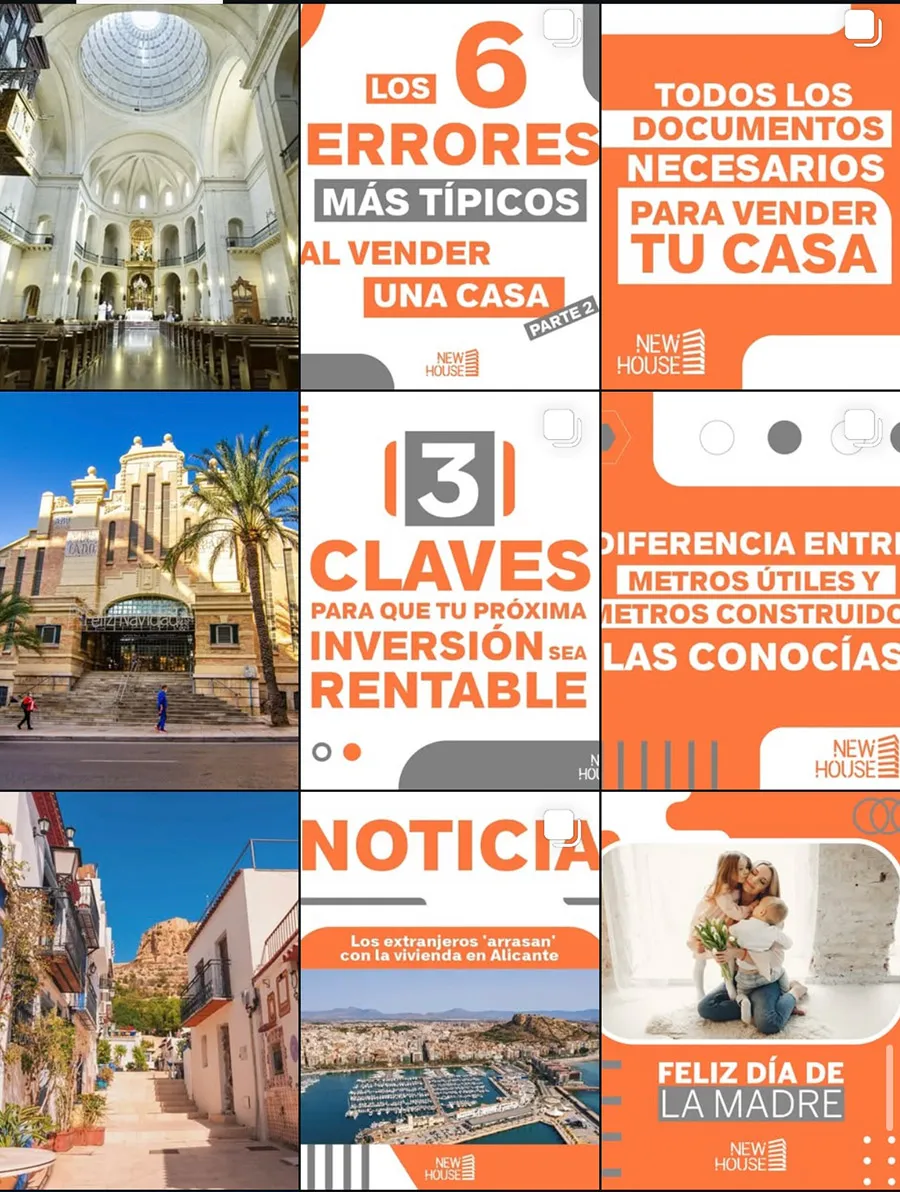 - En Instagram: el estudio de hashtags, investigación de la competencia en RRSS, la creación de contenido de marca, con además el diseño de unos bonitos destacados, un mockup de feed para que viera como quedaría el futuro Instagram de New House, su empresa y un plan de contenidos.